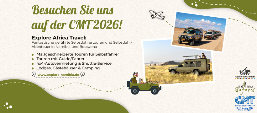 Explore Namibia estará presente en la CMT Die Urlaubsmesse, 17-25 enero 2026, Stuttgart. Todos los interesados en una aventura autoguiada o un recorrido privado en Namibia y/o Botswana están cordialmente invitados a visitar nuestro stand y discutir sus planes de viaje personales con uno de nuestros expertos en viajes.